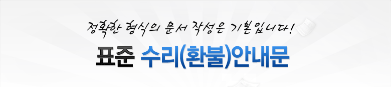 ¼ö¸®(ȯºÒ) µîÀ» ³»¿ëÀ» ¼­½ÄÈ­ÇÏ¿© ¾Ë¸±¶§ »ç¿ëµÇ´Â Ç¥ÁØ ¼ö¸®(ȯºÒ) ¾È³»¹® ÀÔ´Ï´Ù. ¸ñÀû, ³»¿ë, ¹ß½ÅÀÚ Á¤º¸ Ç׸ñÀ¸·Î ±¸¼ºµÇ¾î ÀÖ½À´Ï´Ù