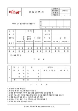 ÃâÀå¿¡¼­ º¹±ÍÈÄ Áõ¸íÇÒ ¶§ »ç¿ëÇÏ´Â ¼­½ÄÀÌ´Ù. ±¸¼º³»¿ëÀº ¼º¸í, ÃâÀå±â°£, ÃâÀå¸ñÀûµîÀ¸·Î ±¸¼ºµÇ¾î ÀÖÀ¸¸ç ÃâÀåÀÚ´Â ±ÍÀÓ Áï½Ã ÃâÀåÁõ¸í¼­¸¦ ±ÙÅ´ã´çÀÚ¿¡°Ô Á¦ÃâÇÏ¿©¾ß ÇÏ¸ç ±ÙÅ´ã´çÀÚ´Â ±× ³»¿ëÀ» È®ÀÎ, ÃâÀå¸í·É´ëÀå¿¡ ±â·ÏÇÏ°í ±ÍÀÓÇ¥½Ã¸¦ ÇÏ¿©¾ß ÇÑ´Ù.