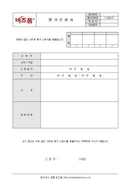 º´°¡¸¦ ½ÅûÇÒ ¶§ »ç¿ëÇÏ´Â º´°¡½Åû¼­ÀÔ´Ï´Ù. ½ÅûÀÚ, ½ÅûÀÏÀÚ, ±â°£, »çÀ¯, ¼¼ºÎ³»¿ë µîÀÇ Ç׸ñÀ¸·Î ±¸¼ºµÇ¾îÀÖÀ¸¸ç º»ÀÎÀÌ Á÷Á¢ ÀÛ¼ºÇÏ¿© Á¦ÃâÇÕ´Ï´Ù.