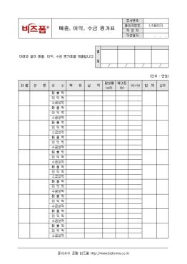 ¿µ¾÷»ç¿øº°·Î ¸ÅÃâ, ÀÌÀÍ, ¼ö±Ý¿¡ °üÇÑ Æò°¡¸¦ ÇÒ ¼ö ÀÖ´Â ¸ÅÃâ, ÀÌÀÍ, ¼ö±Ý Æò°¡Ç¥ÀÔ´Ï´Ù. °úº°, ¼º¸í, ¿ä¼Ò, ¸ñÇ¥, ½ÇÀû µîÀÇ Ç׸ñÀ¸·Î ±¸¼ºµÇ¾îÀÖÀ¸¸ç Æò°¡´ã´çÀÚ°¡ ÀÛ¼º ÇØ´çºÎ¼Àå¿¡°Ô º¸°íÇÕ´Ï´Ù.