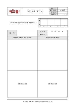 ÀϹÝÀûÀÎ °úÁ¦¿¡ ´ëÇØ °³¼±»çÇ×À» Á¦¾ÈÇϰíÀÚ ÇÒ ¶§ »ç¿ëÇÏ´Â ÀϹݰúÁ¦ Á¦¾È¼­ÀÔ´Ï´Ù. Á¦¸ñ, Á¢¼öÀÏ, Á¦¾È¹øÈ£, ÇöÀç¹æ¹ý, °³¼±»çÇ× µîÀÇ Ç׸ñÀ¸·Î ±¸¼ºµÇ¾îÀÖÀ¸¸ç, ±×¸² ¶Ç´Â »çÁøÀ» ºÎÂøÇÒ ¼ö ÀÖ½À´Ï´Ù.