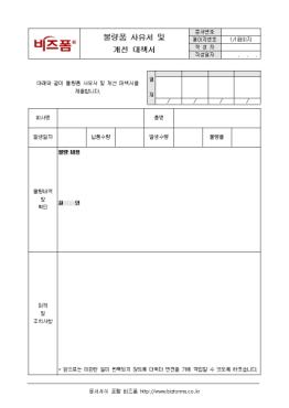 »ý»êǰ ǰÁú°³¼±À» À§ÇÑ ºÒ·®Ç° »çÀ¯¼ ¹× °³¼± ´ëÃ¥¼ ¾ç½ÄÀÔ´Ï´Ù. ǰ¸í, ¹ß»ýÀÏÀÚ, ³³Ç°¼ö·®, ºÒ·®·ü, ºÒ·®³»¿ª ¹× È®ÀÎ, ´ëÃ¥ ¹× Á¶Ä¡»çÇ× µîÀÇ Ç׸ñÀ¸·Î ±¸¼ºµÇ¾î ÀÖÀ¸¸ç ºÒ·®³»¿ë °ú ¿øÀÎÀ» ÀÚ¼¼È÷ ºÐ¼®ÇÏ¿© ±âÀçÇÕ´Ï´Ù.
