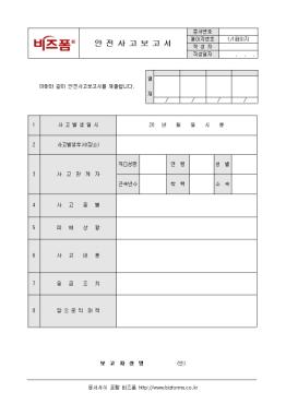 ¾ÈÀü»ç°í¿¡ ´ëÇÑ ÇöȲÀ» ±â·ÏÇÏ°í º¸°íÇÒ ¶§ »ç¿ëÇÏ´Â ¾ÈÀü»ç°íº¸°í¼ÀÔ´Ï´Ù. »ç°í¹ß»ýÀϽÃ, »ç°í¹ß»ýºÎ¼, »ç°í°ü°èÀÚ µîÀÇ Ç׸ñÀ¸·Î ±¸¼ºµÇ¾îÀÖ½À´Ï´Ù.