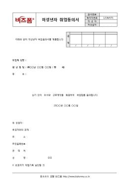¹Ì¼º³âÀÚÀÇ Ãë¾÷ ½Ã ±× µ¿ÀǸ¦ ±¸ÇϰíÀÚ ÇÒ ¶§ ÀÛ¼ºÇÏ´Â ¹Ì¼º³âÀÚ Ãë¾÷µ¿ÀǼ­ÀÔ´Ï´Ù. Ãë¾÷ÀÚ ¼º¸í, »ý³â¿ùÀÏ, ÁÖ¼Ò µîÀÇ Ç׸ñÀ¸·Î ±¸¼ºµÇ¾îÀÖÀ¸¸ç Ä£±ÇÀÚ°¡ Á÷Á¢ ±â·Ï ³¯ÀÎÇÕ´Ï´Ù.
