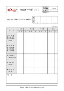 »óǰº°·Î ¼öÀͼºÀ» ºÐ¼®/ º¸°íÇÒ ¶§ »ç¿ëÇÏ´Â »óǰº° ¼öÀͼº º¸°íÇ¥ÀÔ´Ï´Ù. Ç׸ñ, ±Ý¾×, % µîÀÇ Ç׸ñÀ¸·Î ±¸¼ºµÇ¾îÀÖ½À´Ï´Ù.