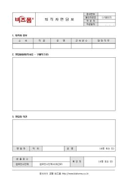 ÅðÁ÷ÀÚ ¹ß»ý ½Ã ¸é´ãÀ» ÅëÇÏ¿© ÅðÁ÷»çÀ¯ µî¿¡ °üÇÑ »çÇ×À» ±â·Ï/ °ü¸®ÇÒ ¼ö ÀÖ´Â ÅðÁ÷ÀÚ¸é´ãÇ¥ÀÔ´Ï´Ù. ÅðÁ÷ÀÚ Á¤º¸, ¸é´ã³»¿ë, ¸é´ãÀÚ ÀÇ°ß µîÀÇ Ç׸ñÀ¸·Î ±¸¼ºµÇ¾îÀÖ½À´Ï´Ù.