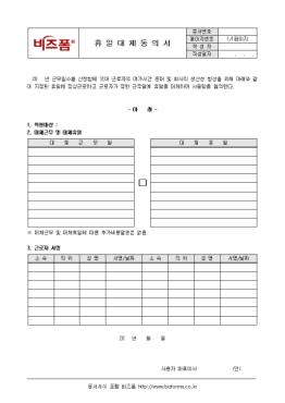 ±Ù·ÎÀÚÀÇ ¿©°¡½Ã°£ Áõ´ë ¹× ȸ»çÀÇ »ý»ê¼º Çâ»óÀ» À§ÇØÁöÁ¤µÈ ÈÞÀÏ¿¡ Á¤»ó±Ù·ÎÇÏ°í ±Ù·ÎÀÚ°¡ Á¤ÇÑ ±Ù¹«ÀÏ¿¡ ÈÞÀÏÀ» ´ëüÇÏ¿© »ç¿ëÇÔÀ» ÇùÀÇÇÑ´Ù´Â ³»¿ëÀÇ ÈÞÀÏ´ëüµ¿ÀǼ­ÀÔ´Ï´Ù. Àû¿ë´ë»ó, ´ëü±Ù¹« ¹× ´ëüÈÞÀÏ, ±Ù·ÎÀÚ ¼­¸í µîÀÇ Ç׸ñÀ¸·Î ±¸¼ºµÇ¾îÀÖ½À´Ï´Ù.