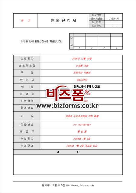 환불요청시 사용할 수 있는 신청서 양식으로, 프로젝트명, 아이디, 결제일, 환불금액 등의 항목으로 구성되어 있습니다.