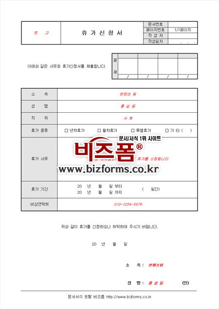 개인사정으로 휴가신청시 사용하는 양식입니다. 소속, 성명, 직위, 휴가종류, 휴가사유, 기간, 비상연락처 등의 항목으로 구성되어 있습니다. 휴사사용시 사전에 신청서를 작성하여 결권자의 승인을 얻어야 합니다.