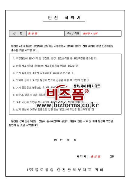 안전 규정을 맹세하고 약속하여 이행할 것을 서류화하여 증명할때 사용되는 표준 근로 서약서입니다.
