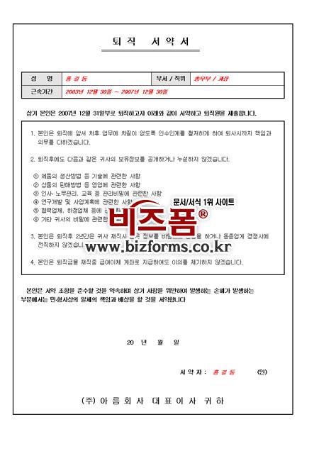 회사 퇴사 규정을 맹세하고 약속하여 이행할 것을 서류화하여 증명할때 사용되는 표준 근로 서약서입니다.