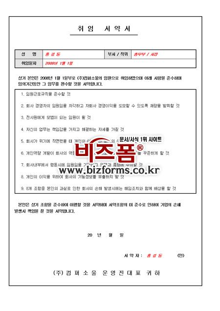 회사 취임 규정을 맹세하고 약속하여 이행할 것을 서류화하여 증명할때 사용되는 표준 근로 서약서입니다.