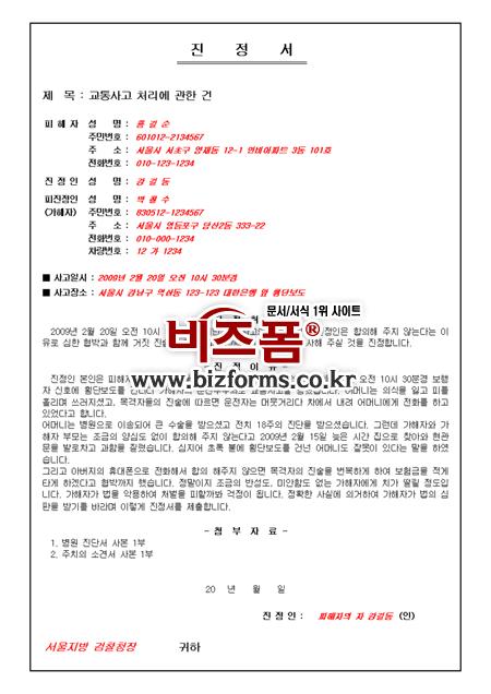 교통사고를 당한 피해자가 엄중한 조사를 바라는 내용의 표준 사건(사고) 진정서입니다. 제목, 피해자, 진정인, 피진정인, 진정취지 등의 항목으로 구성되어있습니다.