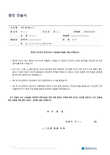 증인의 입장에서 사고의 상황에 대하여 자세한 내용을 서류로 증명할때 사용되는 표준 증인 진술서 입니다. 사건명, 증인 신상정보, 진술내용 항목으로 구성되어 있습니다.