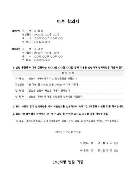 부부간에 이혼하기로 합의를 하기로 하고 작성하는 표준 이혼 합의서 입니다. 남편, 아내의 신상정보, 합의내역 항목으로 구성되어 있습니다.