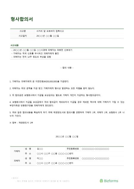 형사 문제를 일으킨 가해자와 피해자가 적절히 피해를 보상해 주고 합의를 하기로 하고 작성하는 문서인 표준 형사 합의서 입니다. 사고명, 합의내용, 가해자, 피해자 신상정보 항목으로 구성되어 있습니다.