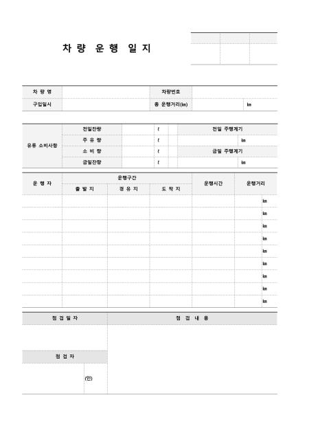 개인 차량의 운행 사항 및 정비내역을 기록할때 사용되는 표준 차량운행일지 입니다. 차량정보, 유류소비사항, 운행자정보, 점검자 및 점검사항 항목으로 구성되어 있습니다.