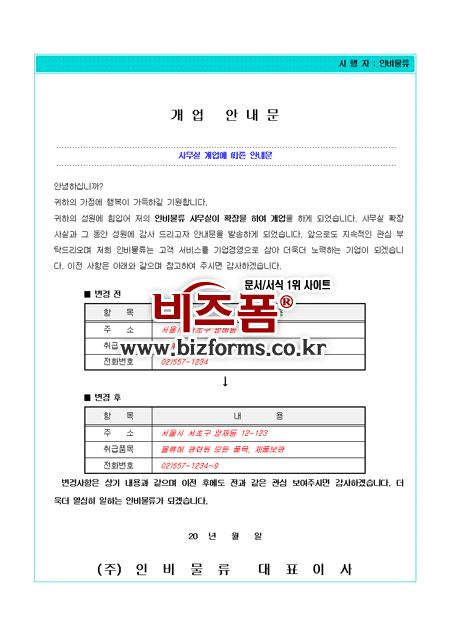 개업내용 등을 서류화하여 알릴때 사용되는 표준 개업 안내문 입니다. 목적, 내용, 발신자 정보로 구성되어 있습니다.
