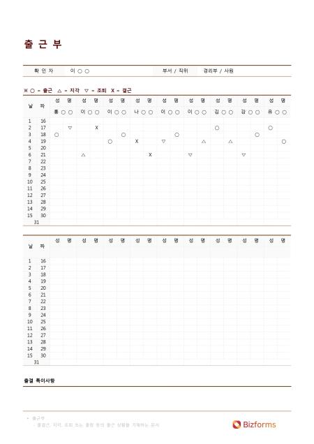 출결근, 지각, 조퇴 또는 출장 등의 출근 상황을 표시하는 표준 출근부(세로형) 입니다.