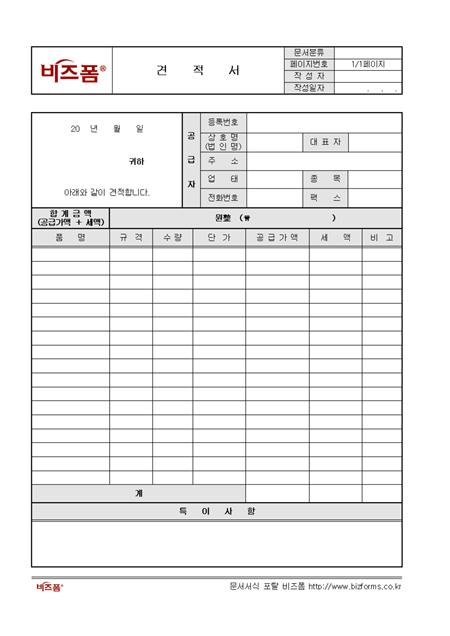 특정 상품 거래를 위하여 각종 경비를 포함시켜 그 가격을 산출하고, 그 내용을 구체적으로 기재할 때 사용할 수 있는 견적서입니다. 공급자, 합계금액, 품명, 규격, 수량 등의 항목으로 구성되어있습니다. 서식 상하단에 회사로고를 삽입할 수 있으며, 문서분류, 페이지번호, 작성자, 작성일자 등의 항목을 공통항목으로 설정해 놓았습니다.