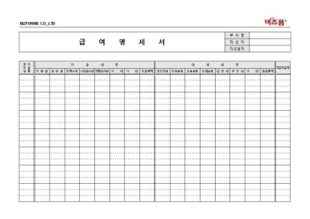 회사로고를 서식 우측 상단에 입력할 수 있도록 제작된 전문가 표준제작 급여명세서입니다. 부서, 직급, 성명, 지급내역, 과세내역, 차감지급액 등의 항목으로 구성되어있습니다.