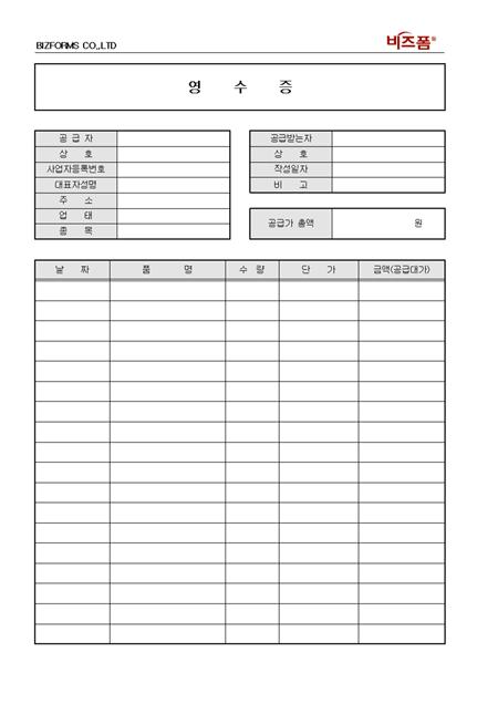 회사로고를 서식 우측 상단에 입력할 수 있도록 제작된 전문가 표준제작 영수증입니다. 공급자, 공급받는자, 공급가 총액, 날짜, 품명, 수량, 단가 등의 항목으로 구성되어있습니다.