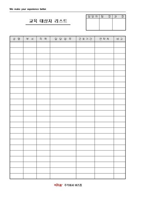 서식 하단에 회사 로고와 함께 서식 상단에 회사 슬로건 등의 문구를 삽입할 수 있도록 제작된 교육 대상자 리스트입니다. 결재란은 담당자, 팀장, 과장 순이며 성명, 부서, 직책, 담당업무 등의 항목으로 구성되어있습니다.