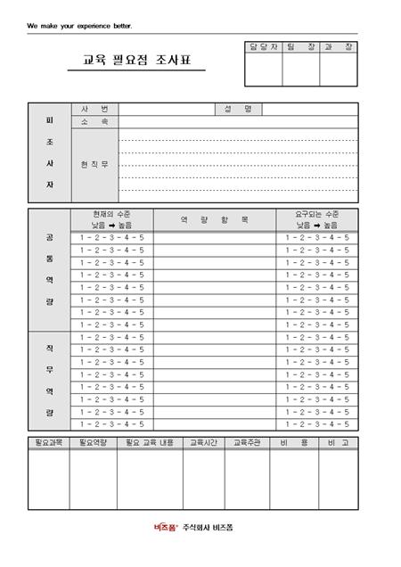 서식 하단에 회사 로고와 함께 서식 상단에 회사 슬로건 등의 문구를 삽입할 수 있도록 제작된 교육 필요점 조사표입니다. 결재란은 담당자, 팀장, 과장 순이며 피조사자, 공통역량, 직무역량, 필요과목 등의 항목으로 구성되어있습니다.