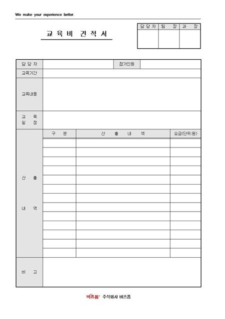 서식 하단에 회사 로고와 함께 서식 상단에 회사 슬로건 등의 문구를 삽입할 수 있도록 제작된 교육비 견적서입니다. 결재란은 담당자, 팀장, 과장 순이며 담당자, 참가인원, 교육기간, 교육내용 등의 항목으로 구성되어있습니다.
