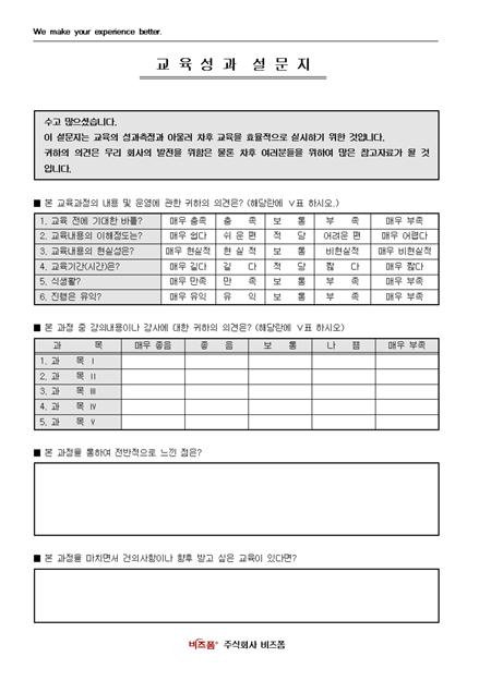 서식 하단에 회사 로고와 함께 서식 상단에 회사 슬로건 등의 문구를 삽입할 수 있도록 제작된 교육성과 설문지입니다. 교육 실시에 관한 참고자료로 활용하실 수 있습니다.