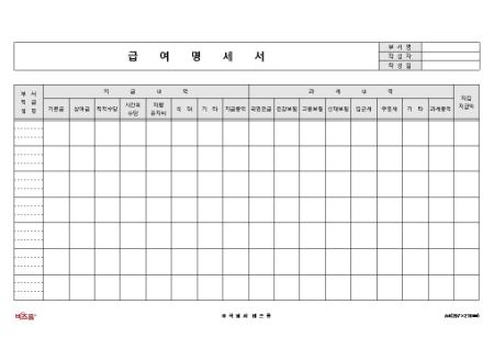 서식 하단에 회사로고 등을 삽입할 수 있으며 부서명, 작성자, 작성일자 항목을 공통항목으로 적용시킨 급여명세서입니다. 부서, 직급, 성명, 지급내역, 과세내역, 차감지급액 등의 항목으로 구성되어있습니다.