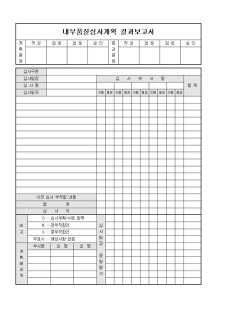글꼴을 굴림체로 통일하고, 작성, 검토, 승인의 순으로 결재란이 구성된 내부품질심사계획 결과보고서입니다. 심사구분, 심사팀장, 심사원, 심사일자 등의 항목으로 구성되어있습니다.