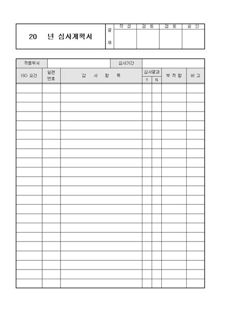 글꼴을 굴림체로 통일하고, 작성, 검토, 승인의 순으로 결재란이 구성된 심사체크리스트입니다. 적용부서, 심사기간, 일련번호, 검사항목, 심사결과 등의 항목으로 구성되어있습니다.
