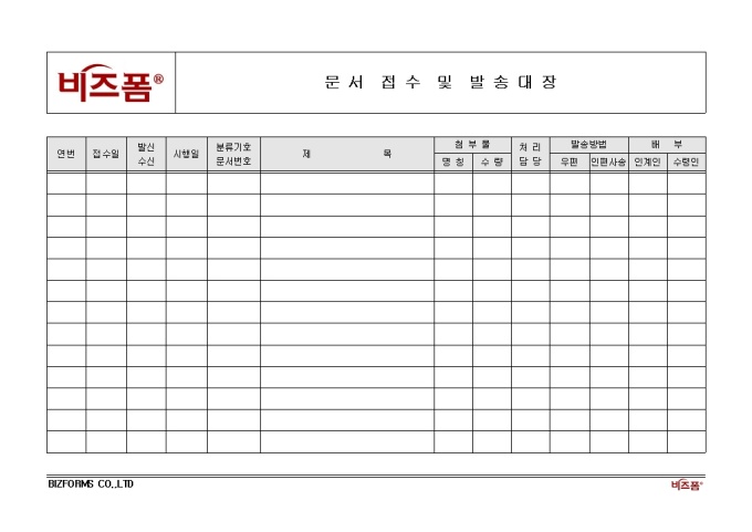 9,000원/월서식 상하단에 회사로고 및 기타정보를 삽입할 수 있는 문서 접수 및 발송대장입니다. 연번, 접수일, 발신수신, 시행일, 제목 등의 항목으로 구성되어있습니다.