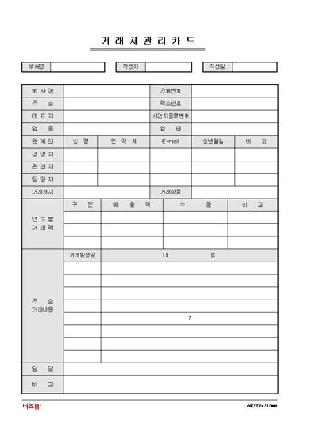 서식 하단에 회사로고 및 기타정보를 삽입할 수 있으며, 부서명, 작성자, 작성일 등의 항목을 공통항목으로 설정해 놓은 거래처관리카드입니다. 회사명, 주소, 대표자, 전화번호, 거래상품, 연도별 거래액 등의 항목으로 구성되어있습니다.