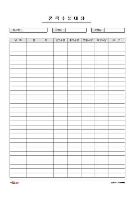 서식 하단에 회사로고 및 기타정보를 삽입할 수 있으며, 부서명, 작성자, 작성일 등의 항목을 공통항목으로 설정해 놓은 품목수불대장입니다. 날짜, 품목, 입고수량, 출고수량, 반품수량 등의 항목으로 구성되어있습니다.