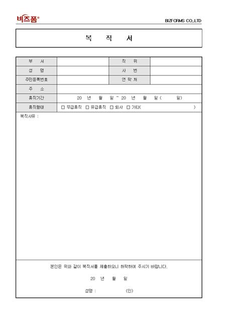서식 상단에 회사로고 및 기타정보를 삽입할 수 있으며 전체 글꼴이 굴림체로 적용되어있는 복직서입니다. 부서, 성명, 휴직기간, 휴직형태, 복직사유 등의 항목으로 구성되어있습니다.