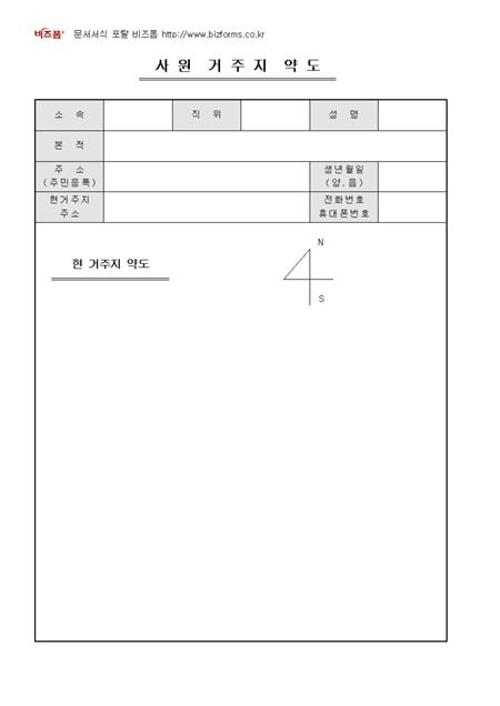 서식 좌측 상단에 회사로고 및 정보를 삽입할 수 있으며, 전체적인 글꼴을 굴림체로 적용시킨 사원 거주지 약도입니다. 소속, 직위, 성명, 본적, 현거주지 주소 등의 항목으로 구성되어있습니다.