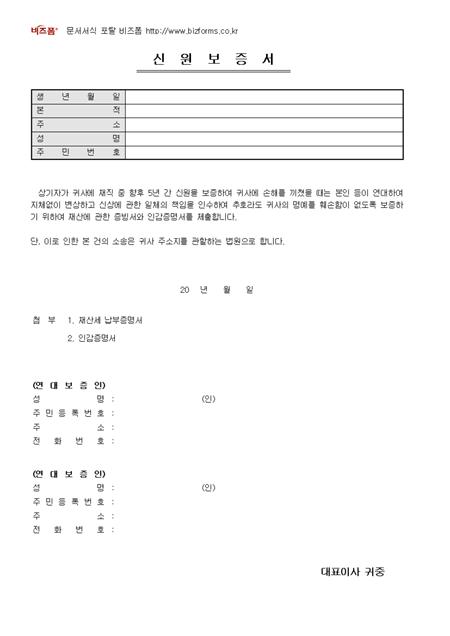 서식 좌측 상단에 회사로고 및 정보를 삽입할 수 있으며, 전체적인 글꼴을 굴림체로 적용시킨 개인별 신원보증서입니다. 생년월일, 본적, 주소, 성명, 주민번호, 연대보증인 등의 항목으로 구성되어있습니다.