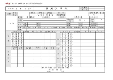서식 좌측 상단에 회사로고 및 정보를 삽입할 수 있으며, 전체적인 글꼴을 굴림체로 적용시킨 인사기록부입니다. 성명, 주민등록번호, 현주소, 보증인, 학력, 가족관계 등의 항목으로 구성되어있습니다.