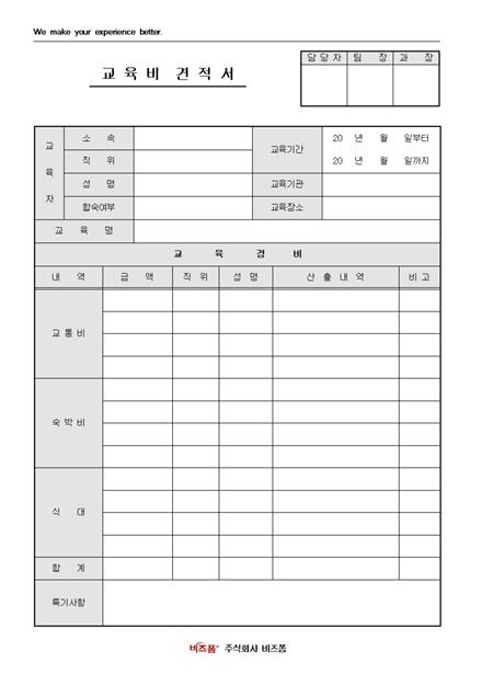 서식 하단에 회사 로고와 함께 서식 상단에 회사 슬로건 등의 문구를 삽입할 수 있도록 제작된 교육비 신청서입니다. 결재란은 담당자, 팀장, 과장 순이며 교육자, 교육기간, 교육기관, 교육명, 교육경비 등의 항목으로 구성되어있습니다.