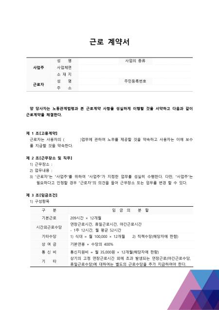 전문가가 직접 작성한 정규직 근로자의 표준 근로계약서입니다. 퇴직연금제도 도입에 따른 근무환경과 형태에 따라 필수항목과 세부항목을 표준화하여 적용하였습니다. 퇴직연금제도 도입을 준비하고 있는 사업장은 참고하여 본인의 사업장에 맞게 활용하여 사용할 수 있습니다. ※ 한글 파일은 알집(Zip)를 다운로드 받아주시기를 바랍니다.