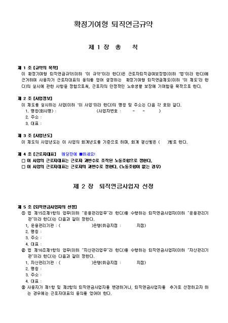 전문가가 직접 작성한 확정급여형(DC) 퇴직연금 규약입니다. 퇴직연금제도 도입에 따른 표준 필수서식입니다. 퇴직연금제도 도입을 준비하고 있는 사업장은 참고하여 본인의 사업장에 맞게 활용하여 사용할 수 있습니다.