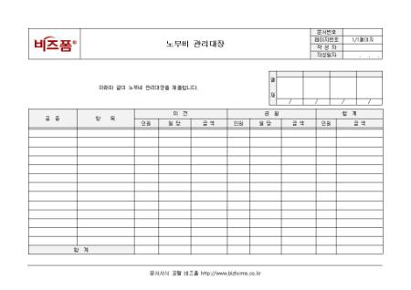 노무비내역을 관리할 수 있는 관리대장양식입니다. 공종, 항목, 인원, 일당, 금액 등의 항목으로 구성되어 있으며 노무비 내역을 상세히 기입할 수 있도록 합니다.