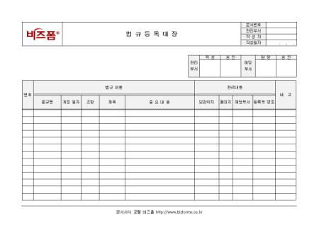 법규등록 내역을 정리할 수 있는 법규등록대장입니다. 법규명, 개정일자, 조항, 제목, 중요내용, 관리내용 등의 항목으로 구성되어 있으며 법규등록내역을 상세히 기입할 수 있도록 합니다.