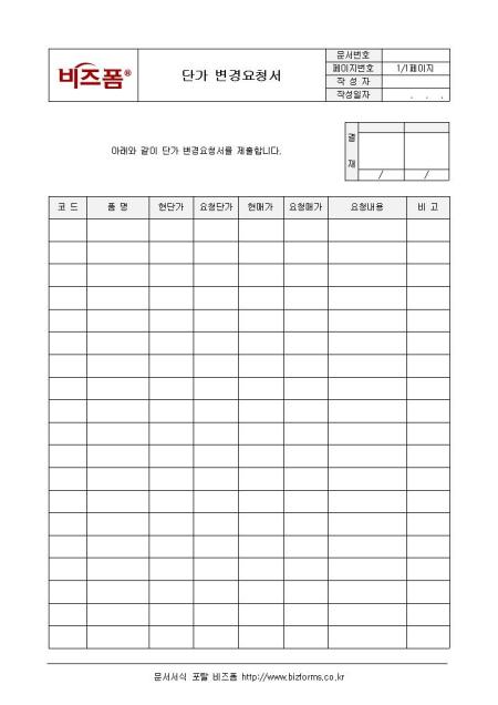 단가 변경을 요청할 수 있는 단가 변경요청서양식입니다. 코드, 품명, 현단가, 요청단가, 현매가, 요청매가, 요청내용 등의 항목으로 구성되어 있으며 단가 변경 요청 내역을 상세히 기입할 수 있도록 합니다.