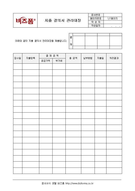 지출 결의서 내역을 관리할 수 있는 관리대장양식입니다. 접수일, 지출항목, 결재금액, 총 금액, 납부방법, 지출일, 처리결과 등의 항목으로 구성되어 있으며 지출 결의 내역을 상세히 기입할 수 있도록 합니다.