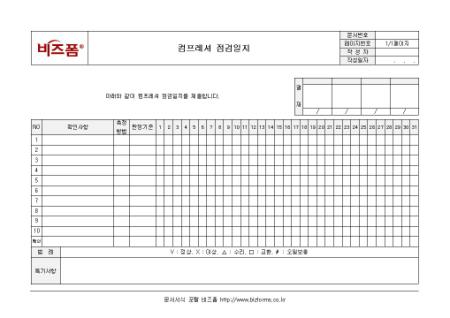 컴프레셔를 점검할 수 있는 점검일지양식입니다. 확인사항, 측정방법, 판정기준, 범례, 특기사항 등의 항목으로 구성되어 있으며 컴프레셔 점검 내역을 상세히 기입할 수 있도록 합니다.