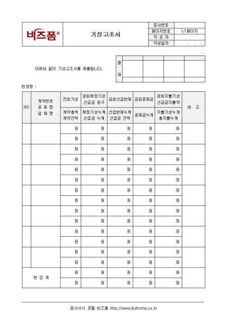 기성고조서를 보고할 수 있는 양식입니다. 계약번호, 공종명, 업체명, 전회기성, 계약총액, 계약잔액 등의 항목으로 구성되어 있으며 기성고조서를 상세히 기입할 수 있도록 합니다.
