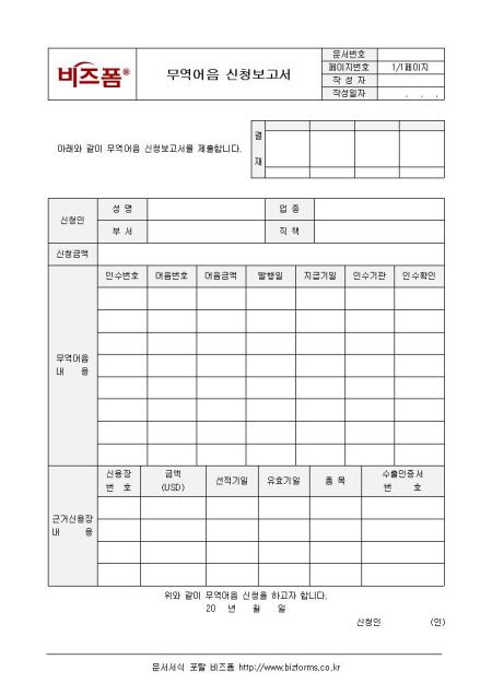 무역어음 신청 현황을 보고할 수 있는 보고서양식입니다. 신청인, 신청금액, 무역어음 내용, 근거 신용장 내용 등의 항목으로 구성되어 있으며 무역어음 신청 내역을 상세히 기입할 수 있도록 합니다.